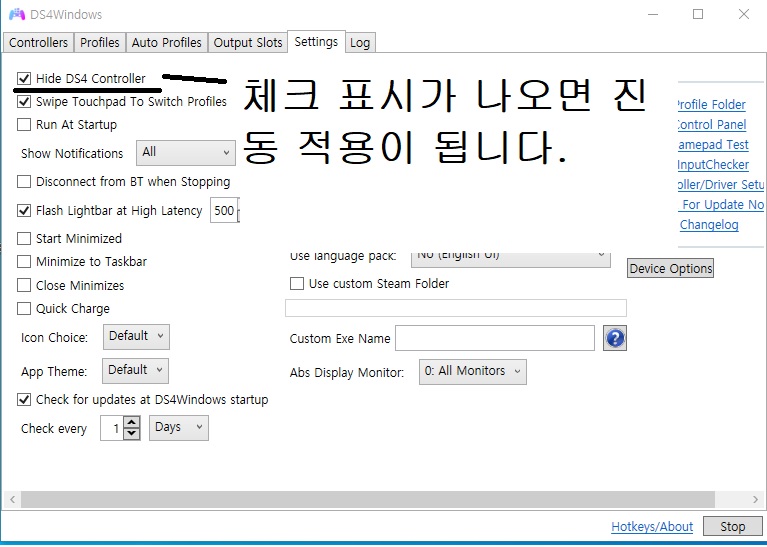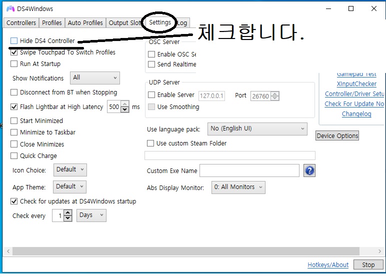 그리고 줄로 표시한 Hide DS4 Controller 체크 박스를 찾습니다.