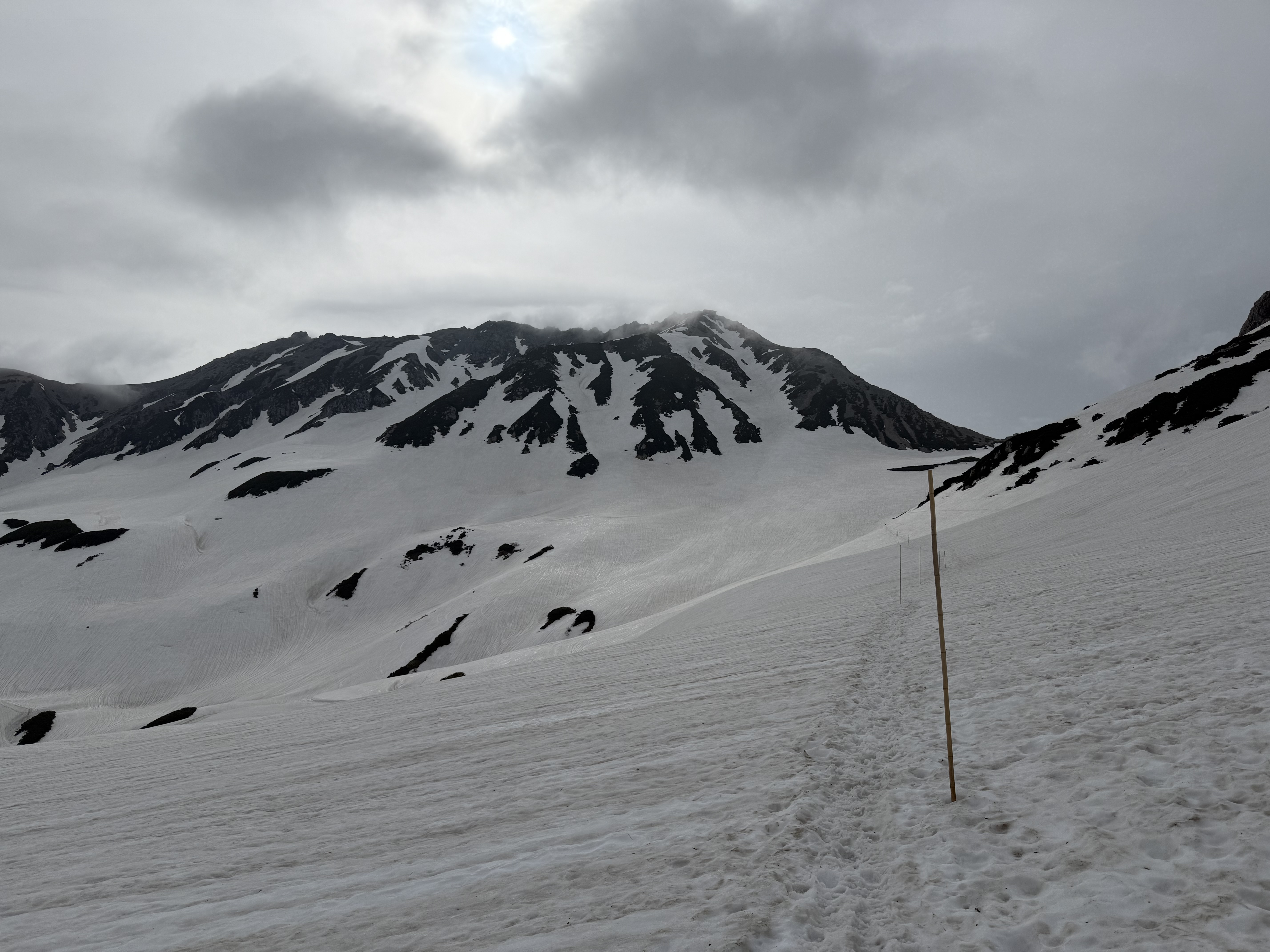 설원 위 대나무 막대기로 표시된 좁은 길을 따라서 걸어올라갔습니다.