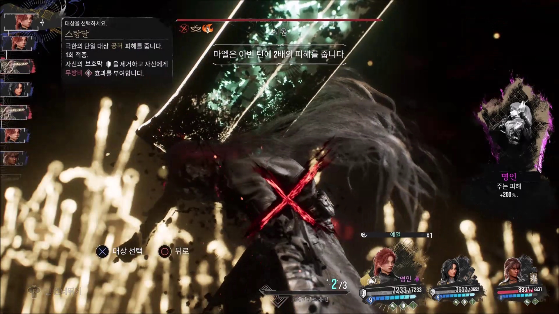 그러면 저격 픽토스의 효과로 파괴가 되면서 보스가 기절합니다.