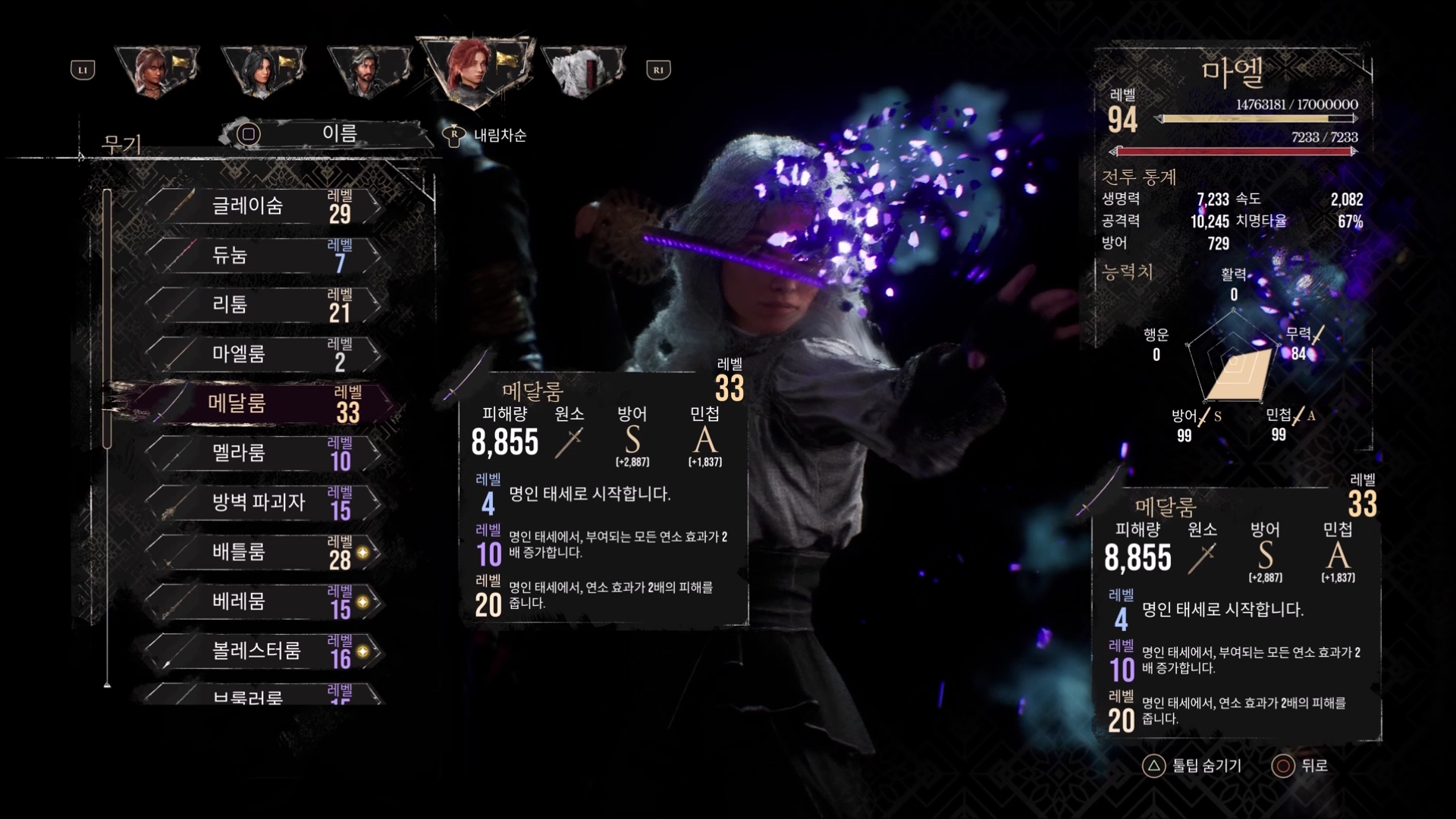 무기는 메달룸에 레벨 33까지 강화된 것이 필요합니다.