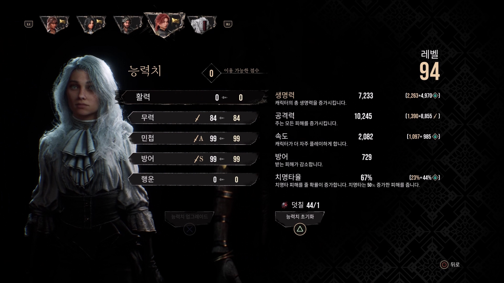 스텟의 경우 방어 99 민첩 99 무력 나머지를 찍어주시면 됩니다.