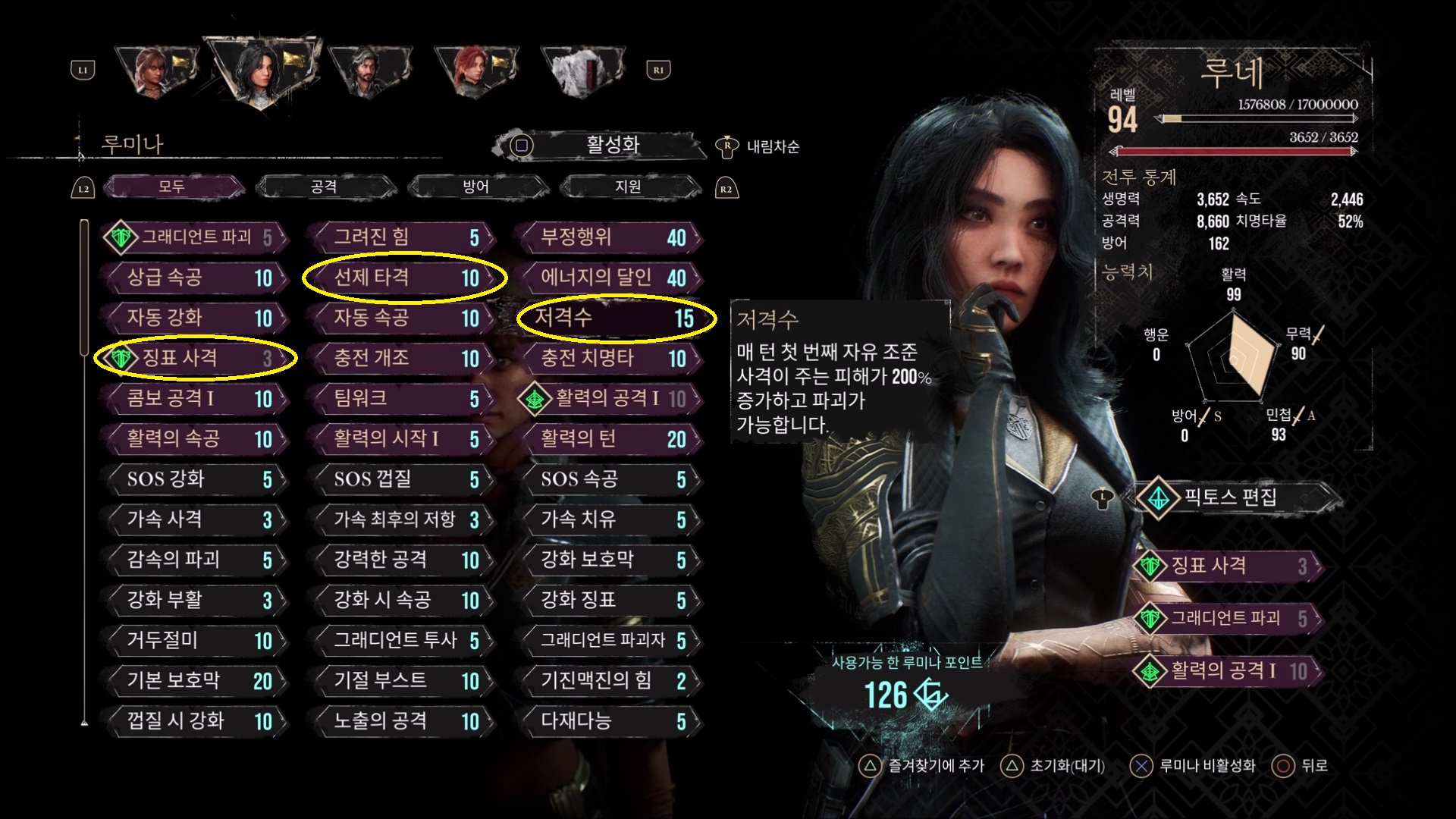 필수 픽토스는 저격수, 선제 타격, 징표 사격입니다.