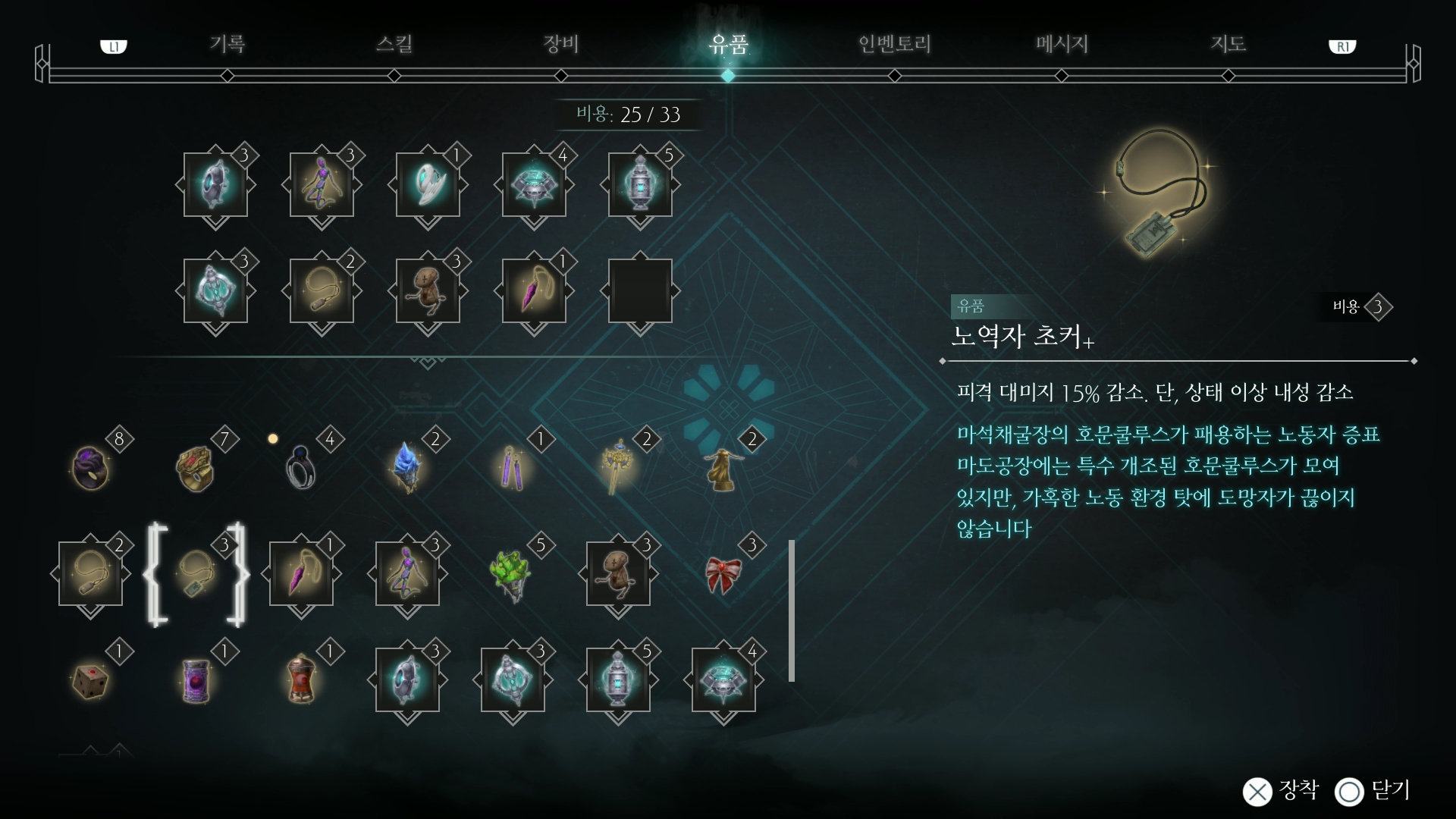 장비는 각력 기어 강화, 결계 순환기, 휴대용 마향로, 마력강화 기어 그리고 나머지는 피격 데미지를 줄여주는 아이템으로 착용합니다.