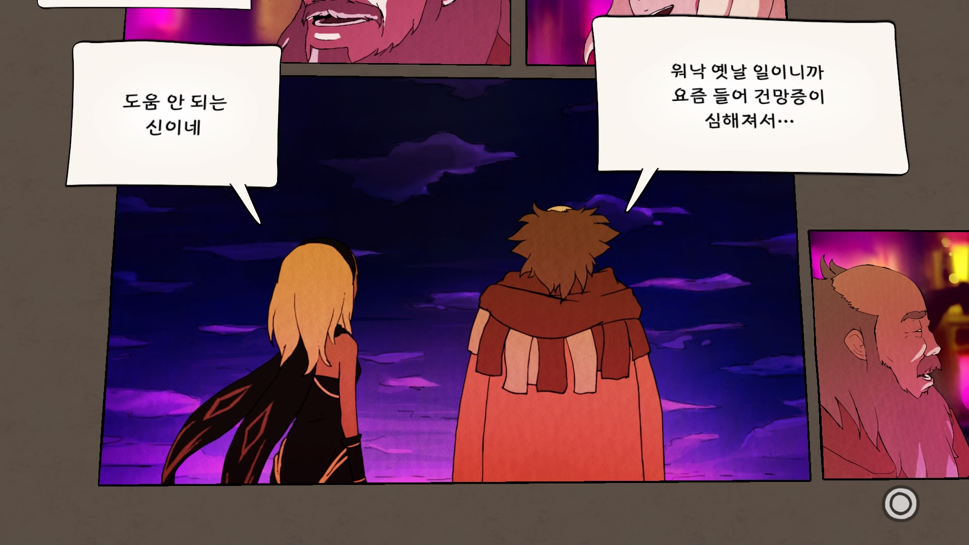 나레이션 이후 가장 처음 보는 화면으로 이런식으로 동화책처럼 한 캐릭터당 총7 챕터로 구성되어있고 모두 클리어하면 마지막에 종언파트가 등합니다.